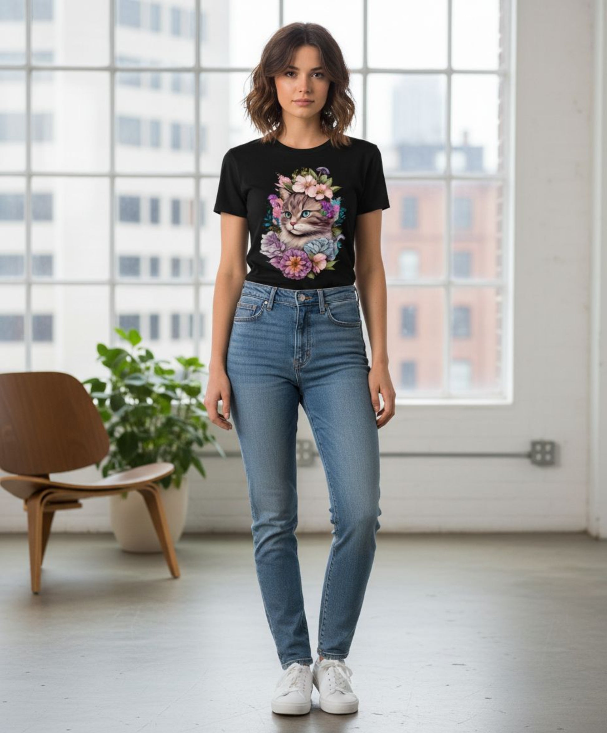 The vibrant cat artwork captures a fun, creative vibe — perfect for cat lovers who enjoy standing out with bright, unique designs. With its modern women’s fit, this shirt flatters all body types and pairs easily with your favorite casual looks.
